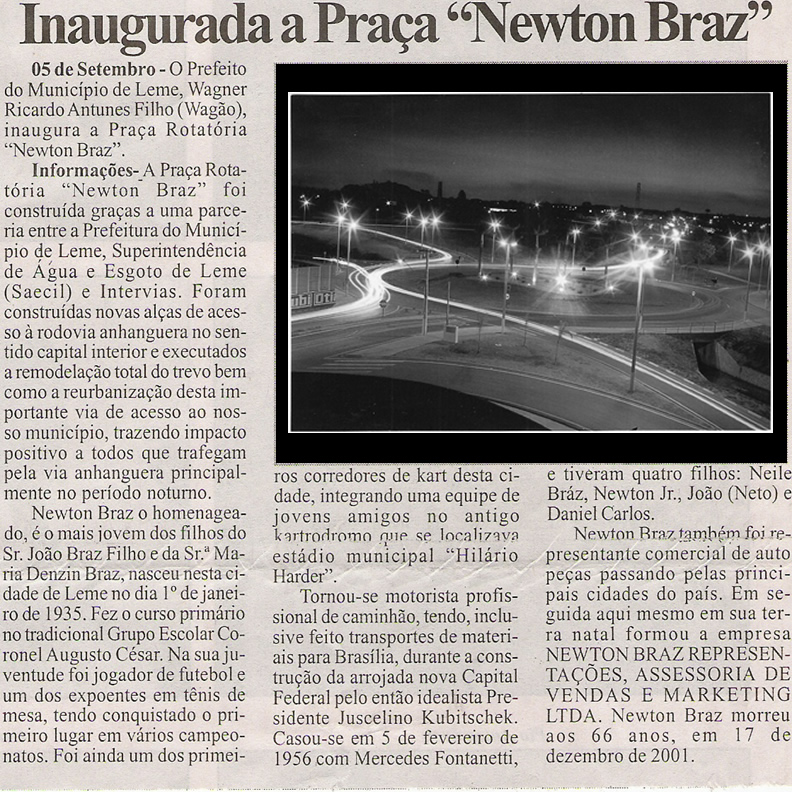 NEWTON BRAZ, o mais jovem dos filhos do Sr. João Braz Filho e Sra Maria Denzin Braz, nasceu nesta cidade de Leme no dia 1º de janeiro de 1.935.